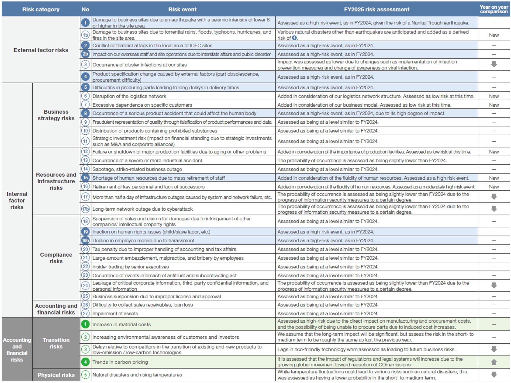 為應對地震等自然災害(IDEC集團的高風險事件之一),在風險管理委員會內成立了一個籌備小組委員會,推動BCP的制定,並與生產部門與事業所的相關人員合作,推動制定基本的災害應對政策、初步應對流程和持續營運的計劃。