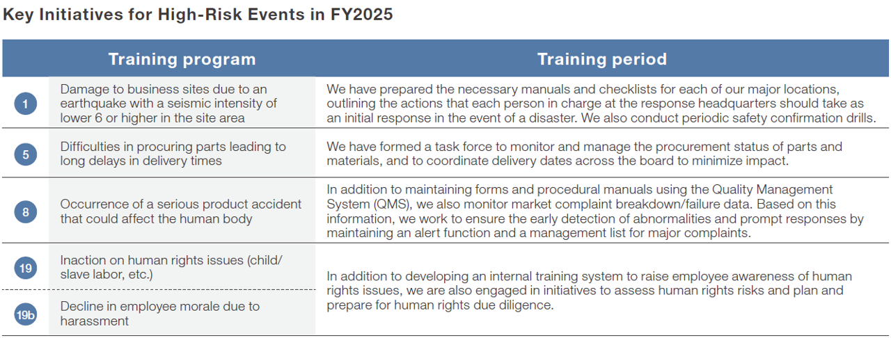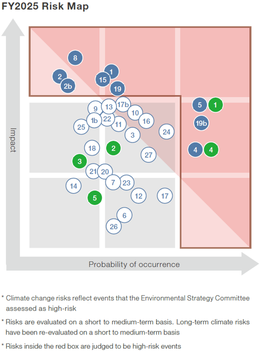 被環境戰略委員會評估為重大的氣候變化風險也被納入並評估為 「風險事件」。被評估為具有高發生率或高影響的事件被指定為「高風險事件」,並為其管轄的每個部門制定年度風險降低目標,在上半年和下半年每六個月檢查一次進展。